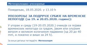 Lokalno se očekuju kratkotrajne vremenske nepogode, jak vetar, pojava grada i veća količina padavina. Posle podne i uveče u severnim, tokom noći i u zapadnim i centralnim predelima prestanak padavina i razvedravanje. U cetvrtak u većini mesta pretežno sunčano, samo će na jugu i istoku veći deo dana biti oblačno mestimično sa kišom. Uveče prestanak padavina, tokom noći na petak razvedravanje.